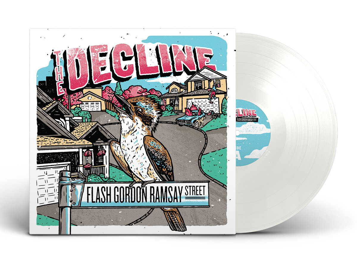 The Decline are back with a collection of 17 punchy tracks ranging in length between just 5 seconds and 4 minutes on their new album 'Flash Gordon Ramsay Street'. The album takes inspiration from subjects ranging from recipe's for vegan buffalo wings, the property market vs. smashed avocado and Zelda gaming tips all the way to philosophical Marxist understandings of false consciousness. Pat Decline pins the main album themes down to "loss, moving on and letting go, identity, mortality and friendship. There’s a lot of references to a bunch of our favourite things like The Legend of Zelda, food, the ocean, and the fun times we have had getting in a van and playing skate punk."